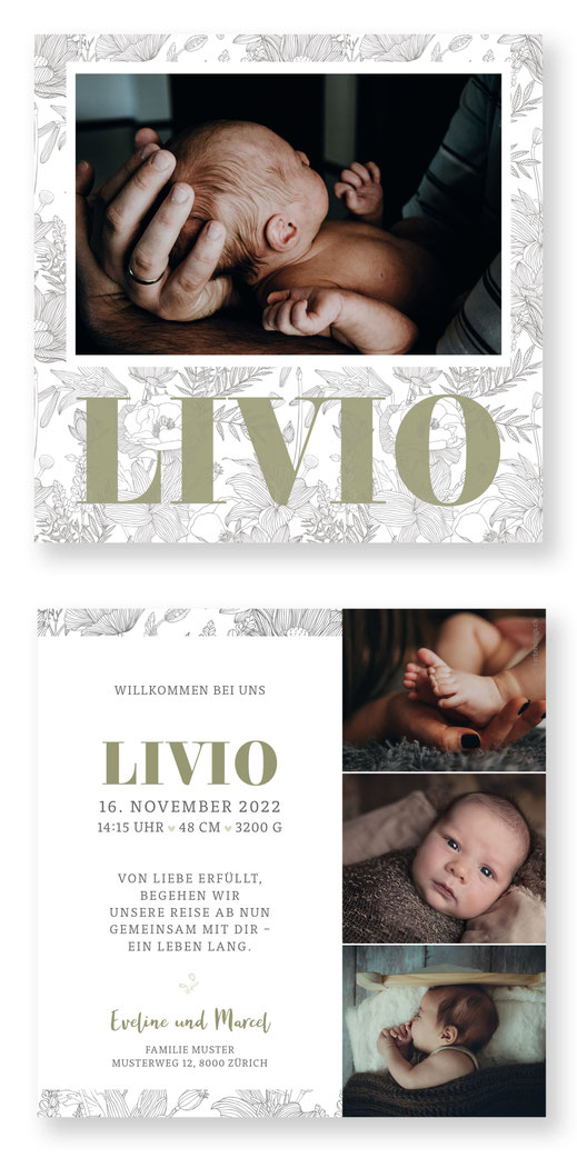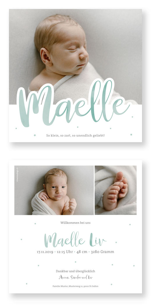 Übrigens könnt ihr aus allen 2-seitgen Babykarten auch eine 4-SEITIGE GEBURTSKARTE gestalten lassen oder eine GEBURTSANZEIGE MIT ANHÄNGER der Preis dafür bleibt sich analog der Preisliste.